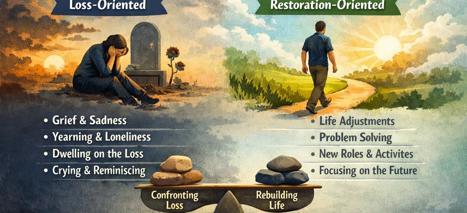 Restoration-oriented coping is the side of grief that is most frequently misunderstood β and most frequently used as evidence against oneself. It is when you turn away from the direct confrontation of loss, however temporarily, and back toward the business of living.