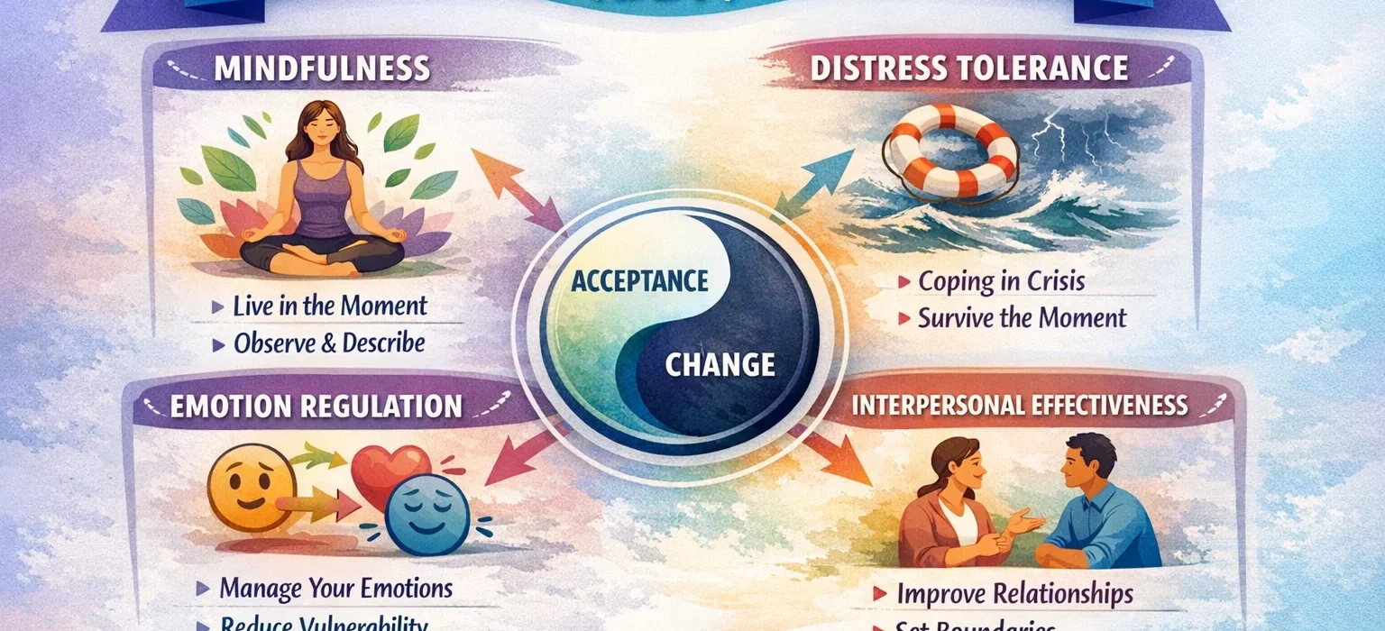 DBT provides practical, evidence-based skills for navigating intense emotions, relationship challenges, and crisis moments — with balance, clarity, and self-respect.